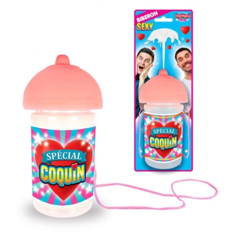 Ce biberon sein de 250 ml est imprimé des inscriptions « Spécial Coquin » avec un embout en forme de poitrine féminine et un file rose pour le garder autour du cou.