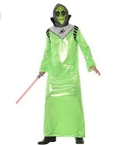 Le déguisement se compose d’une tunique verte à manches longues avec motif espace, et d’un masque alien.