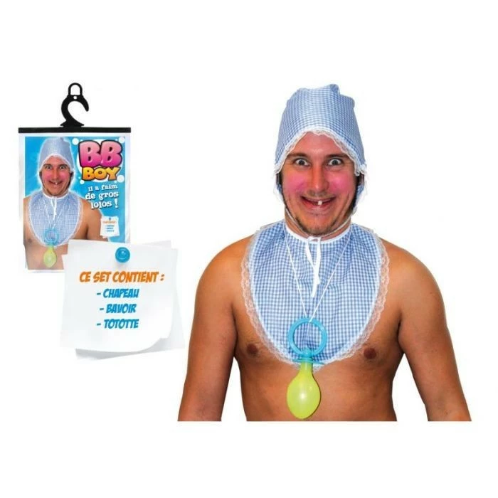 Cette panoplie de déguisement « BB Boy » contient un bavoir à carreaux bleus et blancs décoré de dentelle blanche sur les extrémités, un chapeau assorti et une grosse tétine de bébé de couleur bleu.