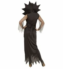 Déguisement de sorcière avec chapeau, veste noire, ainsi qu’une chemise et un pantalon rouge et noir .