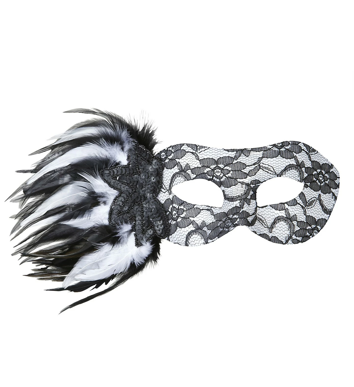 Masque blanc avec de la dentelle noire décoré de plumes.