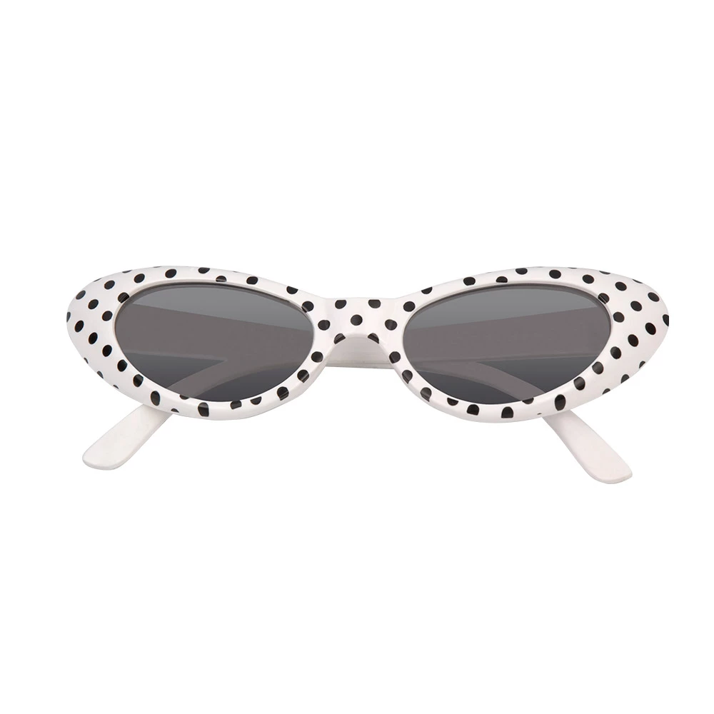 Ces lunettes sont disponibles en noires à pois blancs, blanches à pois noirs, en rose à pois blancs ainsi qu’en blanc à pois roses. Les verres sont de forme ovale et sont teintés. Attention ces lunettes ne protègent pas du soleil.