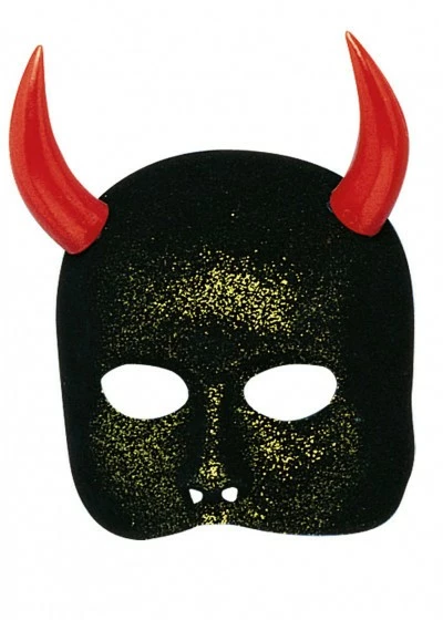Masque de diable souple en plastique noir à paillettes dorées avec cornes rouges.