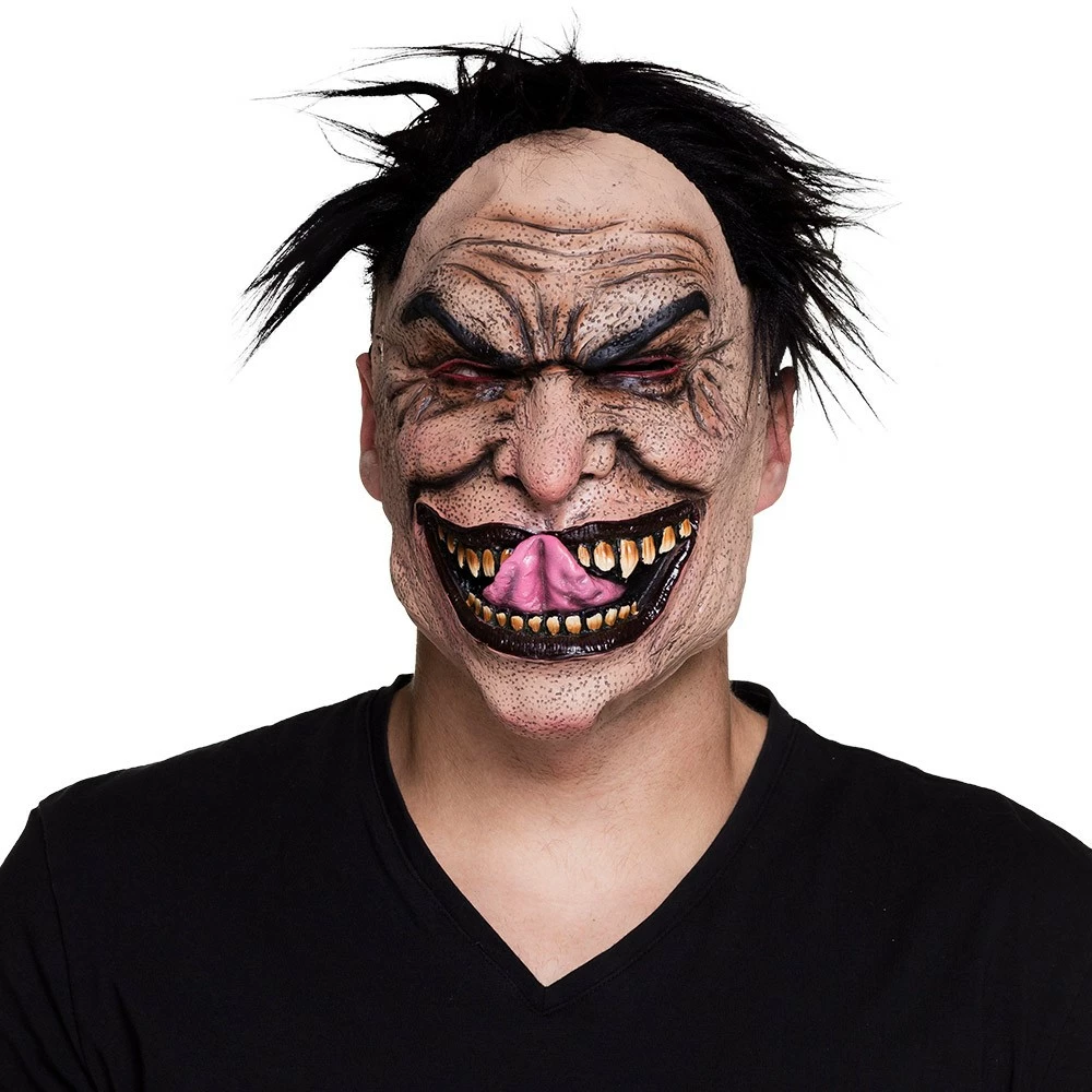 Masque en latex se composant de faux-cheveux noir et d’un visage effrayant.