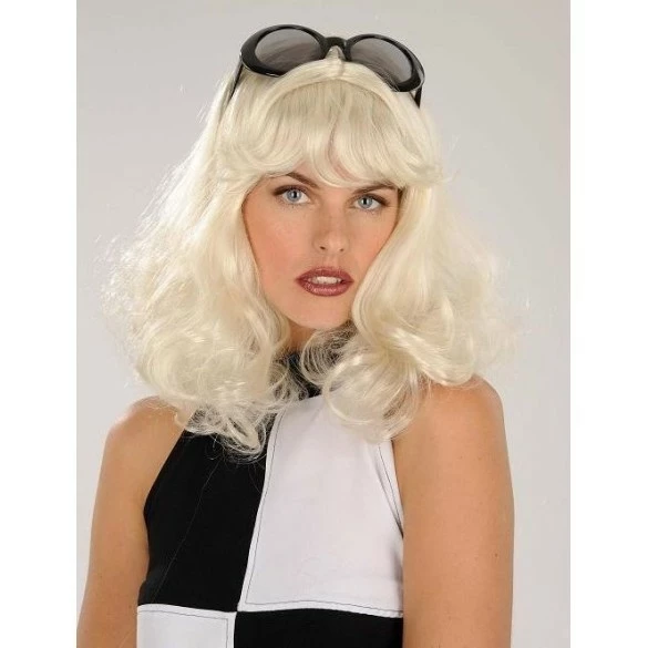 Perruque de couleur blond, châtain ou noire avec une frange et les cheveux épais et bouclés aux pointes.