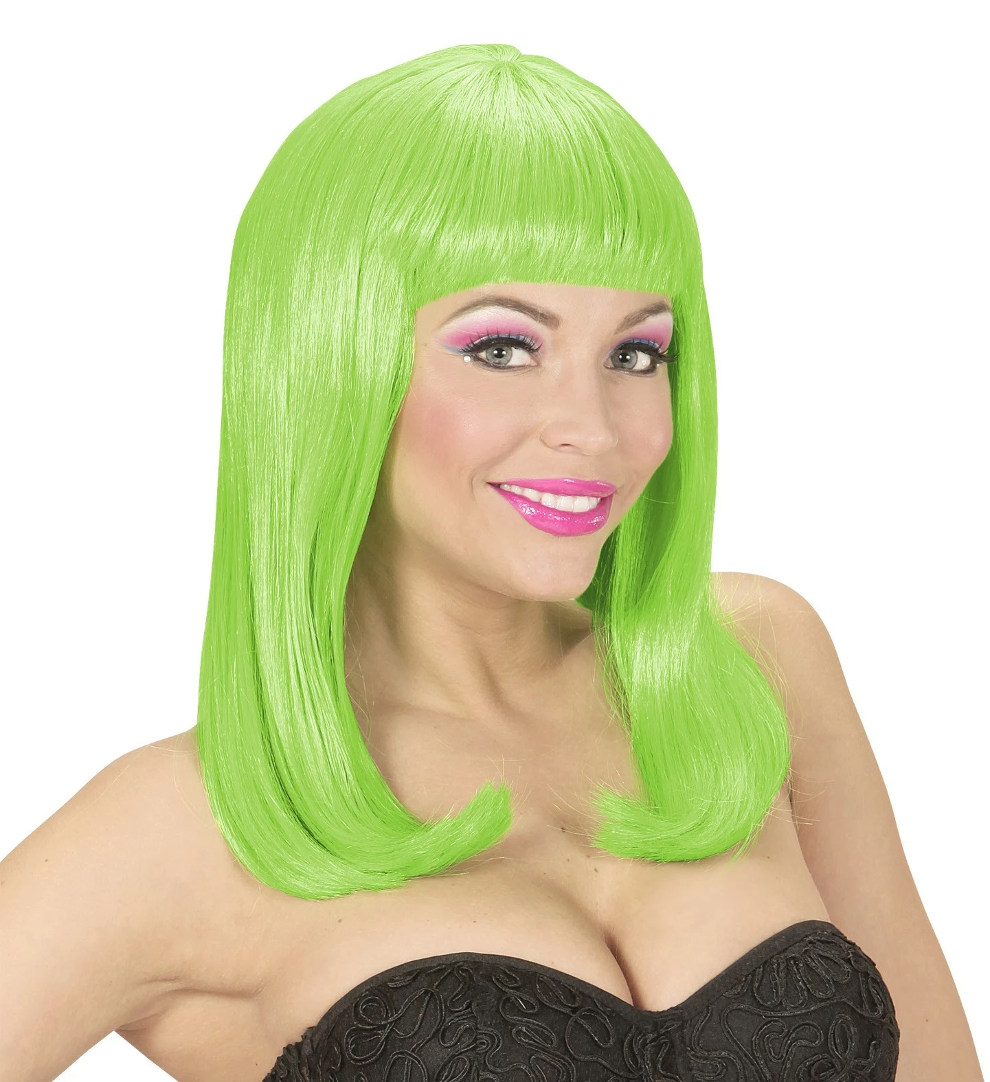 Perruque verte néon qui arrive au niveau du haut de la poitrine avec frange pour adulte
