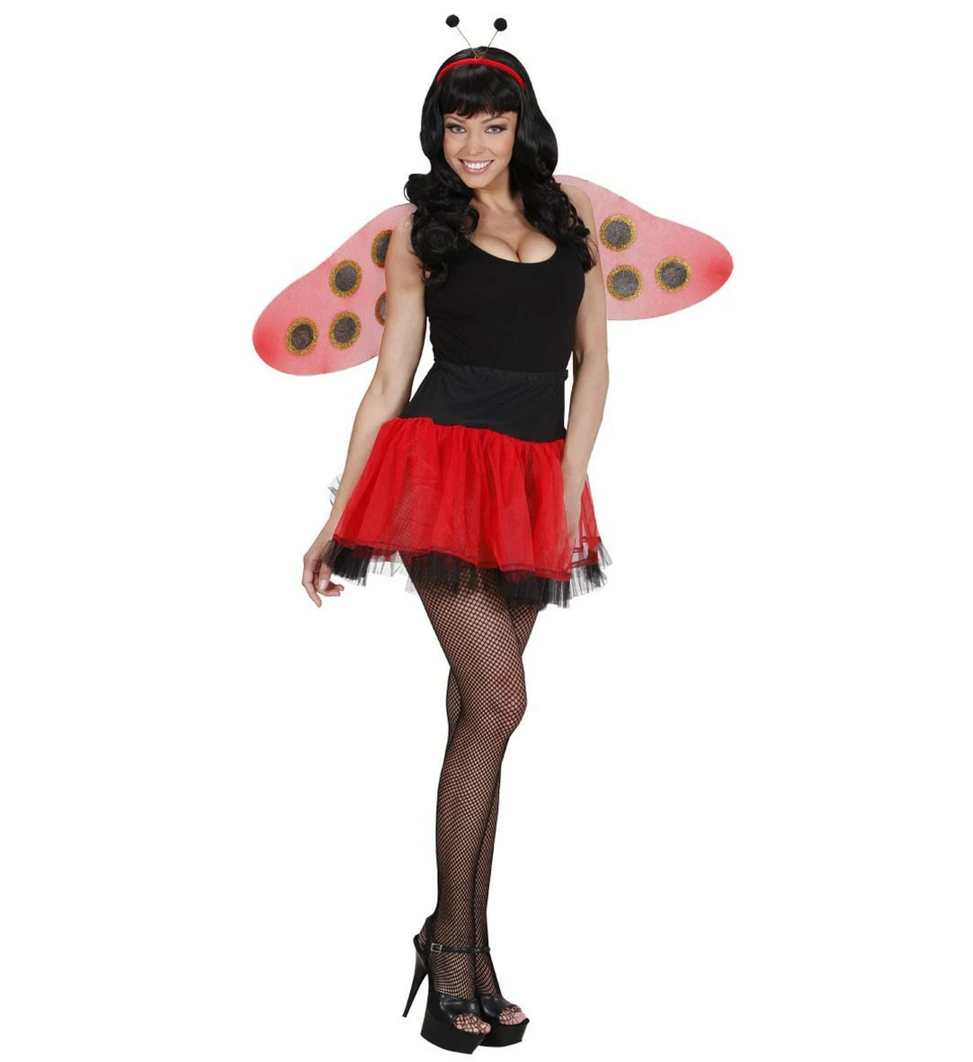 Ce set contient une paire d’ailes rouges et noires décorées de paillettes dorées et d’un serre-tête avec les antennes.