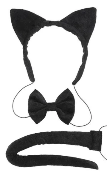 Ce set est composé d’un serre-tête oreilles de chat en velours noir, d’un nœud papillon et d’une queue assortie.