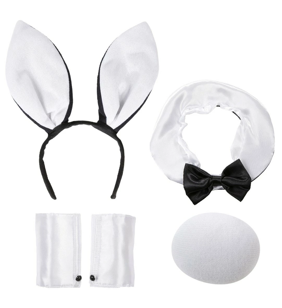 Ce kit est composé d’un serre-tête décoré d’oreilles de lapin blanches sur le devant et noir derrière, de manchettes blanches, d’une petite queue ronde blanche et d’un col blanc orné d’un nœud papillon noir.
